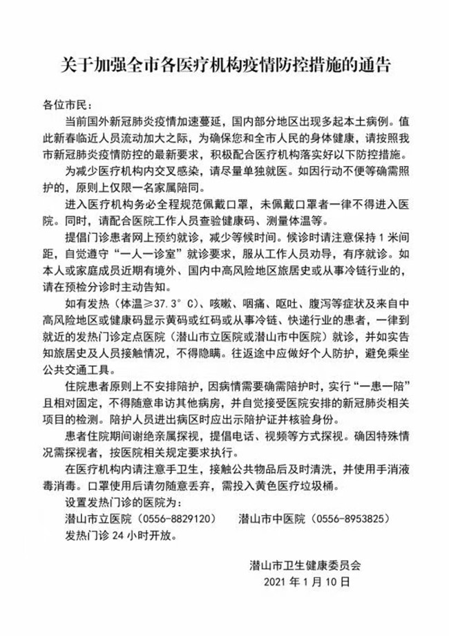 關(guān)于加強(qiáng)全市各醫(yī)療機(jī)構(gòu)疫情防控措施的通告