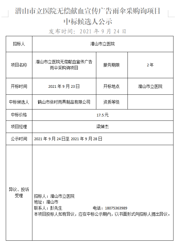 潛山市立醫(yī)院無償獻(xiàn)血宣傳廣告雨傘采購詢項(xiàng)目中標(biāo)候選人公示