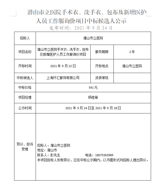潛山市立醫(yī)院手術(shù)衣、洗手衣、包布及新增醫(yī)護(hù)人員工作服詢價(jià)項(xiàng)目中標(biāo)候選人公示