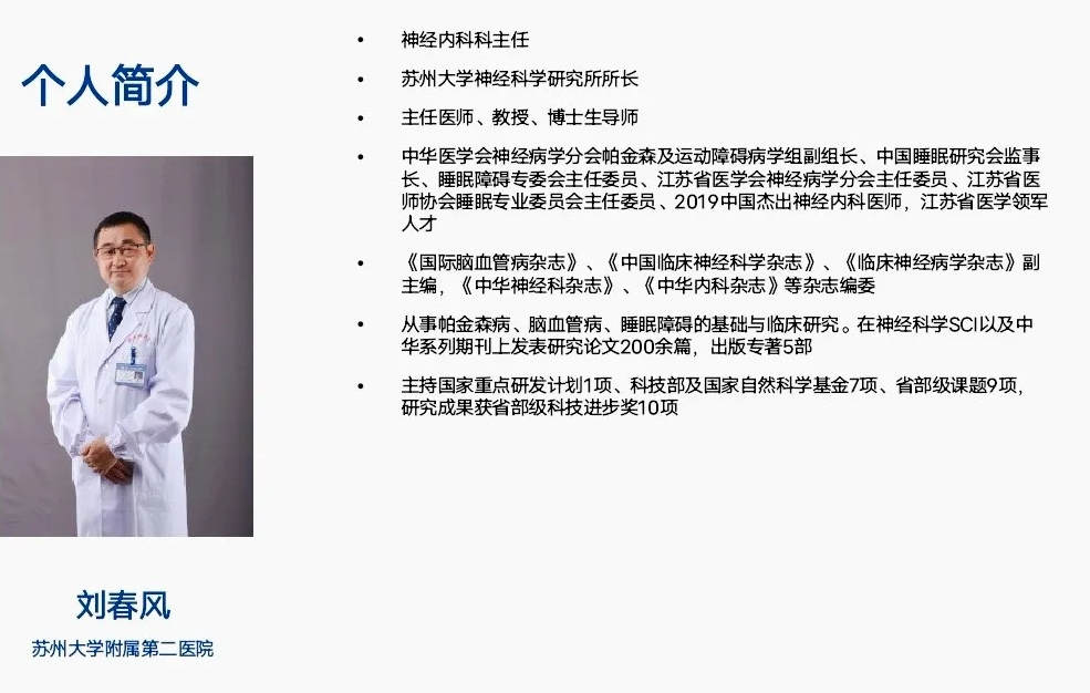 劉春風(fēng),主任醫(yī)師、教授、博士生導(dǎo)師。蘇州大學(xué)神經(jīng)科學(xué)研究所所長(zhǎng),附屬第二醫(yī)院神經(jīng)內(nèi)科主任。中華醫(yī)學(xué)會(huì)神經(jīng)病學(xué)分會(huì)帕金森及運(yùn)動(dòng)障礙病學(xué)組副組長(zhǎng),中國(guó)睡眠研究會(huì)監(jiān)事長(zhǎng)、睡眠障礙專委會(huì)主任委員,江蘇省醫(yī)學(xué)會(huì)神經(jīng)病學(xué)分會(huì)主任委員,江蘇省醫(yī)師協(xié)會(huì)睡眠專業(yè)委員會(huì)主任委員。2019中國(guó)杰出神經(jīng)內(nèi)科醫(yī)師,江蘇省醫(yī)學(xué)領(lǐng)軍人才。