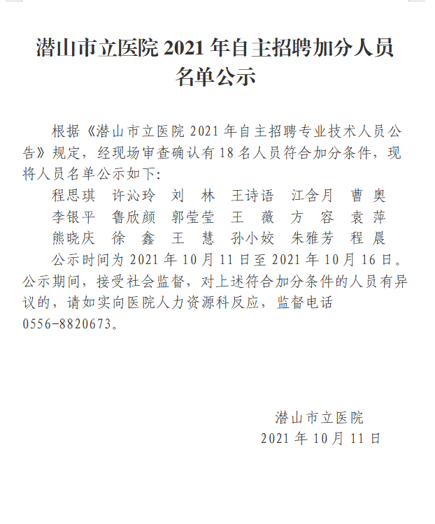 潛山市立醫(yī)院2021年自主招聘加分人員 名單公示