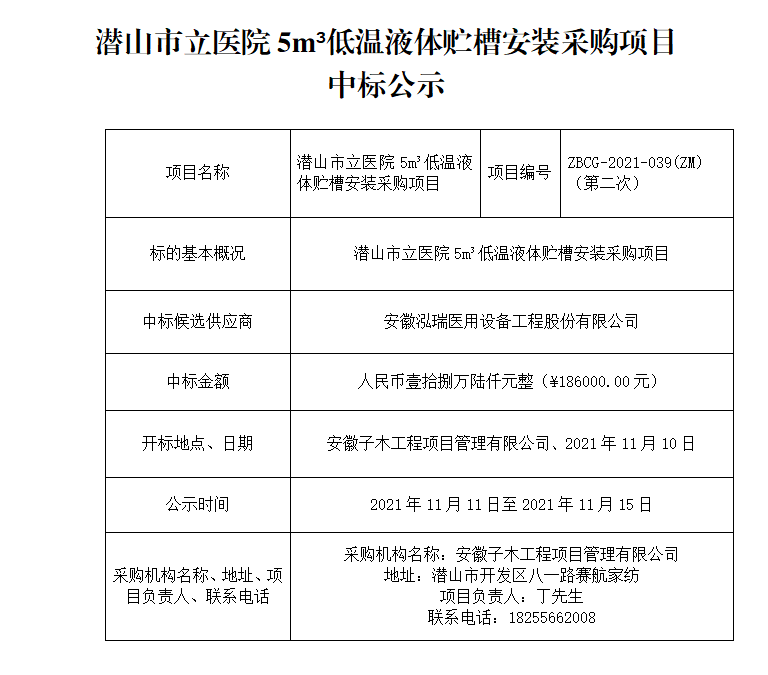 潛山市立醫(yī)院5m3低溫液體貯槽安裝采購項目中標公示