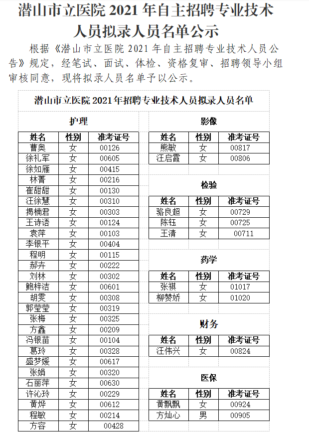 潛山市立醫(yī)院2021年自主招聘專業(yè)技術(shù)人員擬錄人員名單公示