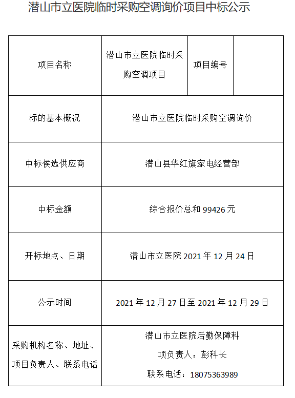 潛山市立醫(yī)院臨時(shí)采購(gòu)空調(diào)詢價(jià)項(xiàng)目中標(biāo)公示