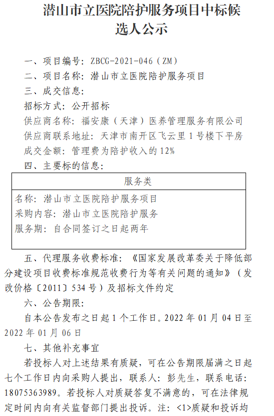 潛山市立醫(yī)院陪護服務(wù)項目中標候 選人公示