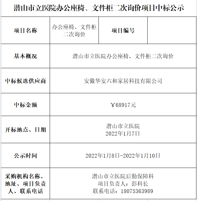潛山市立醫(yī)院辦公座椅、文件柜二次詢(xún)價(jià)項(xiàng)目中標(biāo)公示