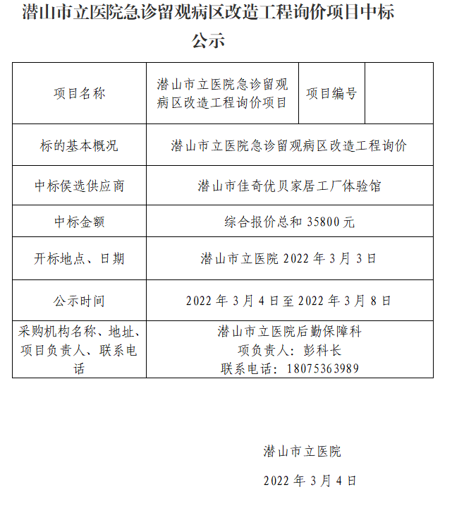 潛山市立醫(yī)院急診留觀病區(qū)改造工程詢價(jià)項(xiàng)目中標(biāo)公示