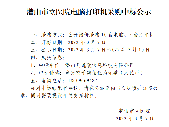 潛山市立醫(yī)院電腦打印機(jī)采購(gòu)中標(biāo)公示