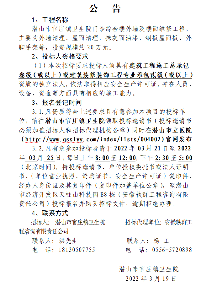 潛山市立醫(yī)院緊密型醫(yī)共體成員單位官莊鎮(zhèn)衛(wèi)生院門診綜合樓外墻及樓面維修工程招標(biāo)公告
