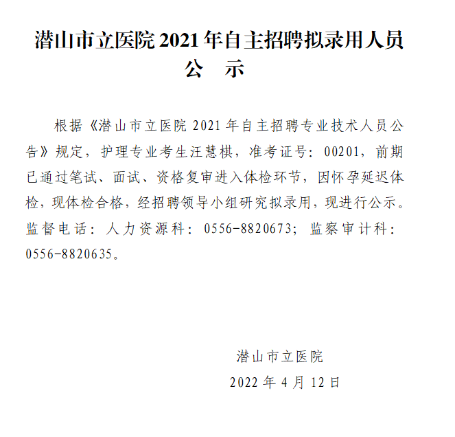 潛山市立醫(yī)院2021年自主招聘擬錄用人員公示