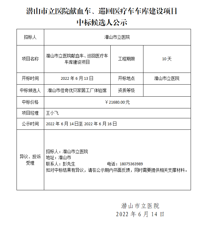 潛山市立醫(yī)院獻(xiàn)血車、巡回醫(yī)療車車庫建設(shè)項(xiàng)目 中標(biāo)候選人公示