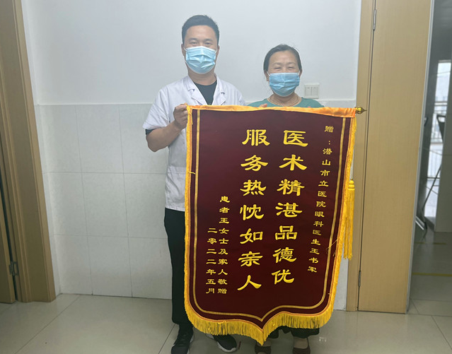 6月23日下午,患者王女士專程從太湖縣趕到我院將一面印有“醫(yī)術精湛品德優(yōu) 服務熱忱如親人”的錦旗送到了我院眼科副主任王書軍手中,再三感謝王主任在住院期間的精心治療和健康指導,誠摯表達了對醫(yī)務人員的感激之情。