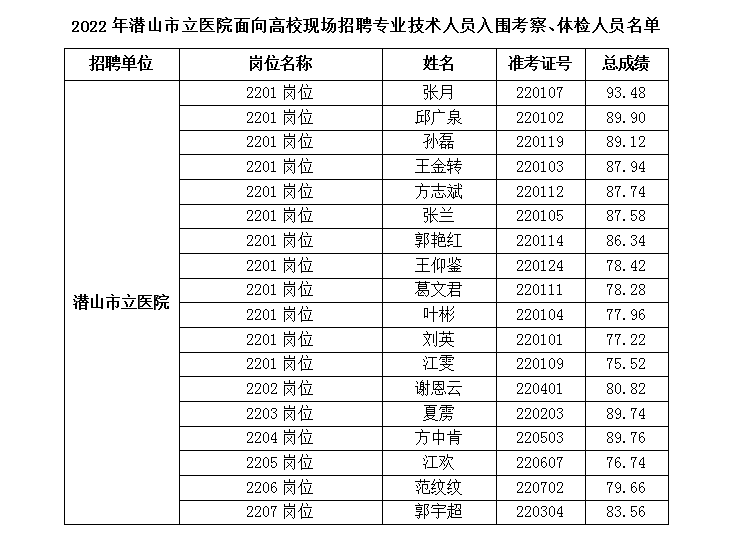 根據(jù)《2022年潛山市立醫(yī)院面向高校現(xiàn)場招聘專業(yè)技術(shù)人員公告》規(guī)定,經(jīng)報名、資格審核、面試等程序,現(xiàn)將2022年潛山市立醫(yī)院面向高?,F(xiàn)場招聘專業(yè)技術(shù)人員入圍考察、體檢人員名單予以公布。