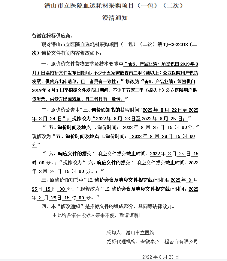 潛山市立醫(yī)院血透耗材采購(gòu)項(xiàng)目(一包)(二次)澄清通知