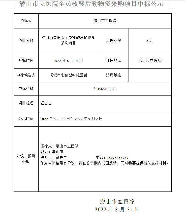 潛山市立醫(yī)院全員核酸后勤物資采購項(xiàng)目中標(biāo)公示