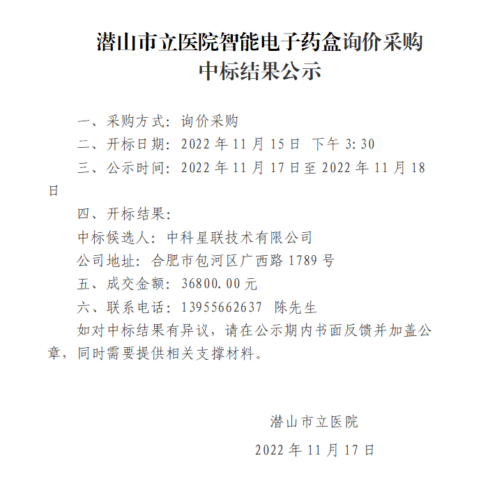 潛山市立醫(yī)院智能電子藥盒詢價采購中標結果公示