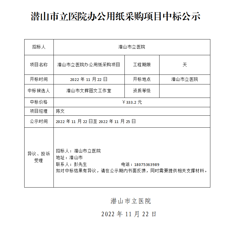 潛山市立醫(yī)院辦公用紙采購項目中標(biāo)公示