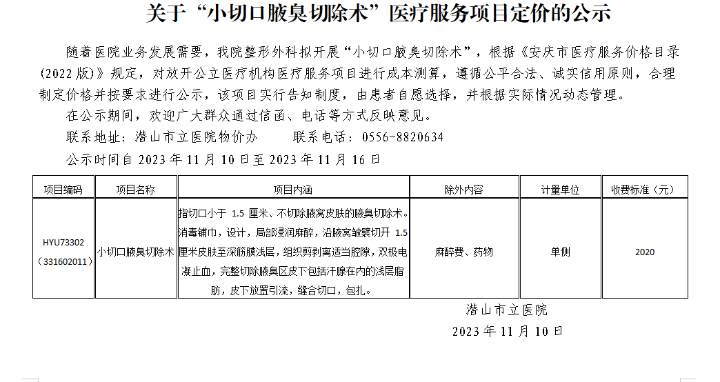 關(guān)于“小切口腋臭切除術(shù)”醫(yī)療服務(wù)項(xiàng)目定價(jià)的公示