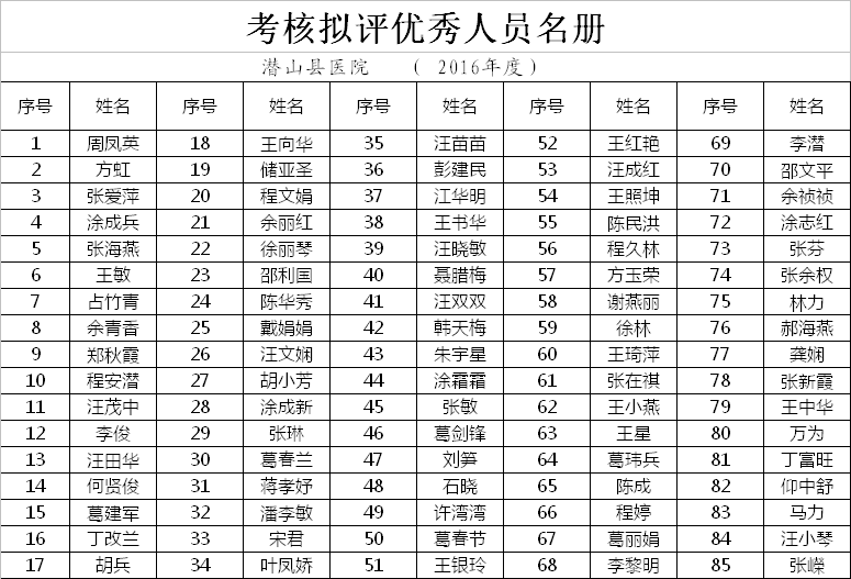 潛山縣醫(yī)院2016年度考核擬評優(yōu)人員公示