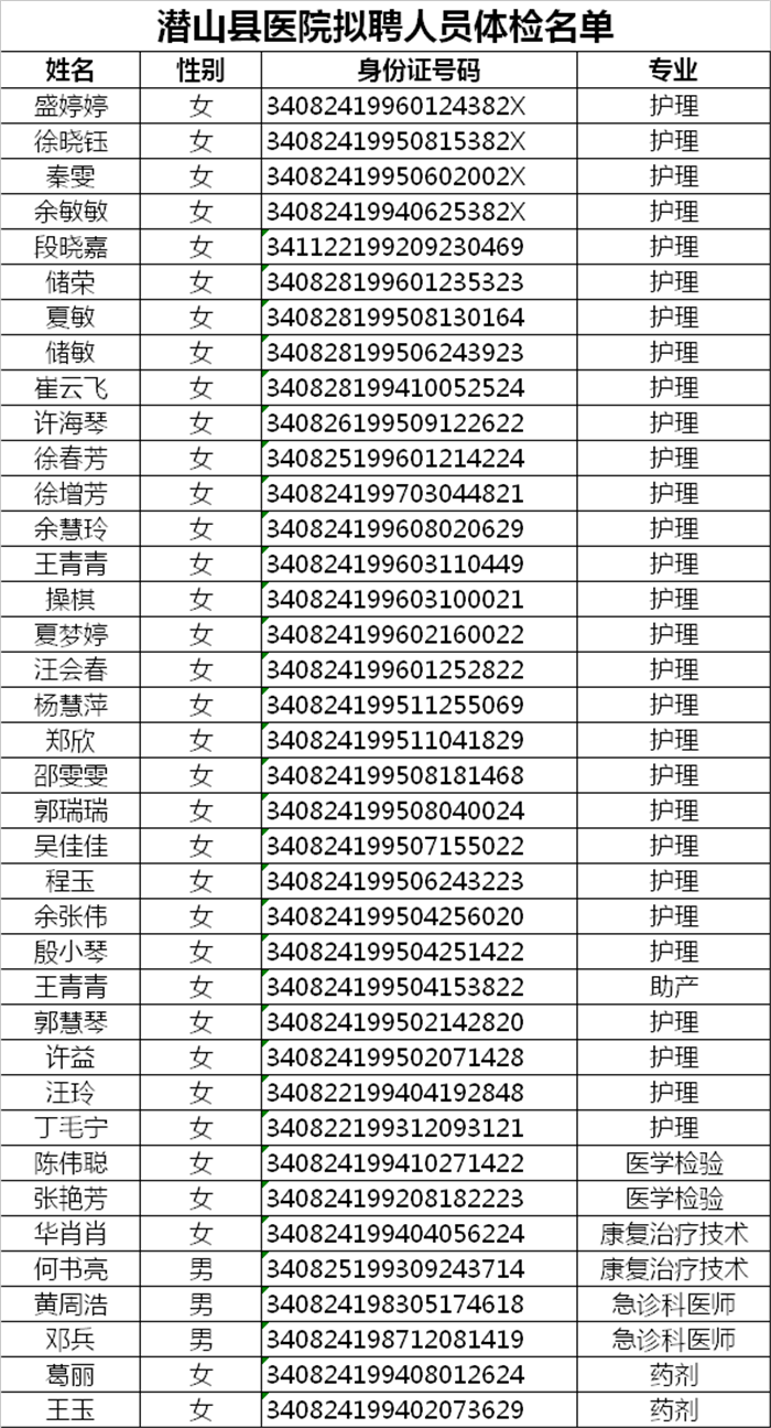 根據(jù)我院招聘衛(wèi)生專業(yè)技術(shù)人員的工作安排,特通知以下人員于2017年8月30日上午8:00攜帶身份證、2張一寸彩色照片到潛山縣醫(yī)院門診5樓體檢中心參加招聘體檢(體檢費350元自理)。