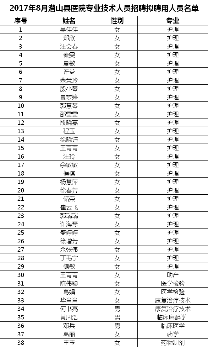 附:2017年8月潛山縣醫(yī)院專業(yè)技術(shù)人員招聘擬聘用人員名單