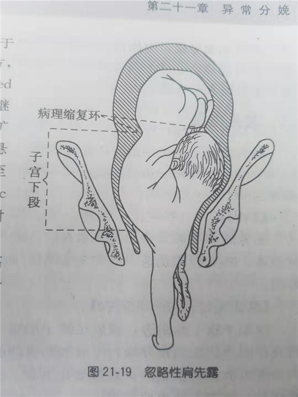 肩先露是指胎體橫臥在骨盆入口以上,其縱軸和母體縱軸相垂直,先露部為肩。臨產(chǎn)后,隨著宮縮不斷加強(qiáng),胎肩及胸廓一部分被擠入盆腔內(nèi),胎體折疊彎曲,胎頸被拉長,上肢脫出陰道口外,胎頭和胎臀被阻于骨盆入口上方,形成忽略性肩先露(見示意圖),若不及時(shí)處理,容易造成子宮破裂,威脅母兒生命。