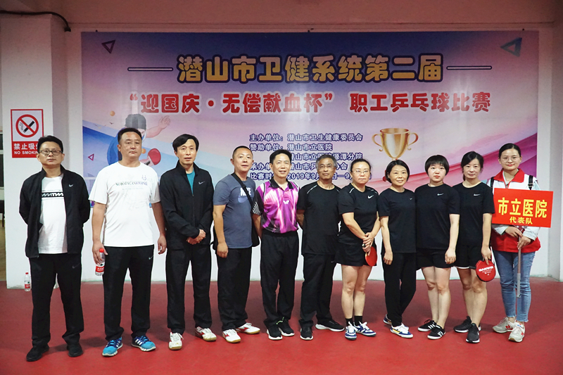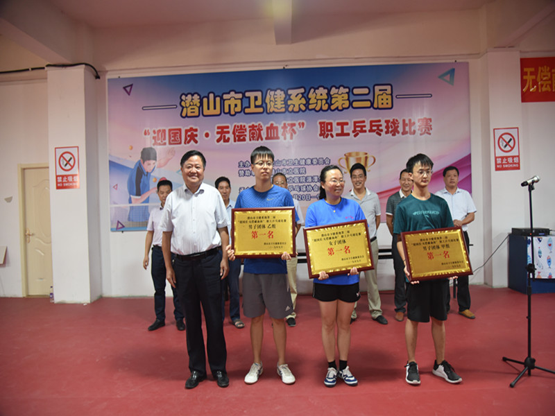 為慶祝中華人民共和國(guó)成立70周年,豐富職工業(yè)余文化生活,大力宣傳無(wú)償獻(xiàn)血,引導(dǎo)廣大市民積極參與無(wú)償獻(xiàn)血活動(dòng)。2019年9月20日—9月22日,潛山市衛(wèi)健委在潛山市乒協(xié)球館舉行潛山市衛(wèi)健系統(tǒng)第二屆“迎國(guó)慶、無(wú)償獻(xiàn)血杯”職工乒乓球比賽,共有39支球隊(duì)參加了比賽。通過(guò)三天的激烈角逐,我院乒乓球隊(duì)勇獲佳績(jī),市立醫(yī)院余井分院隊(duì)獲得男子甲組團(tuán)體第一名,市立醫(yī)院隊(duì)、市獻(xiàn)血辦隊(duì)分別獲得男子乙組團(tuán)體第一、二名,市立醫(yī)院女子隊(duì)獲得女子團(tuán)體第一名。