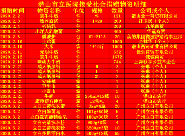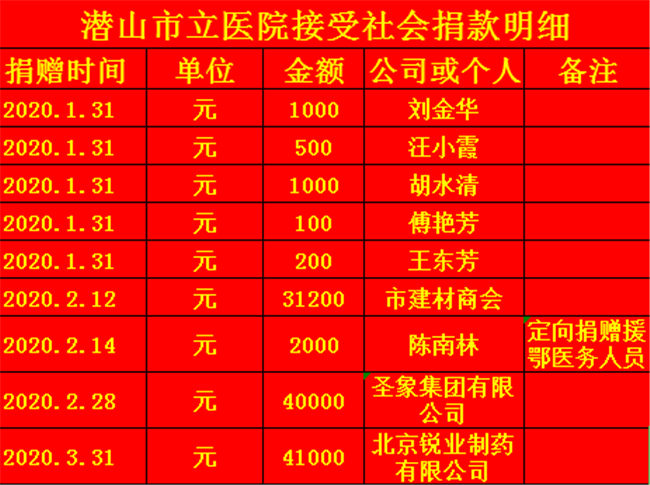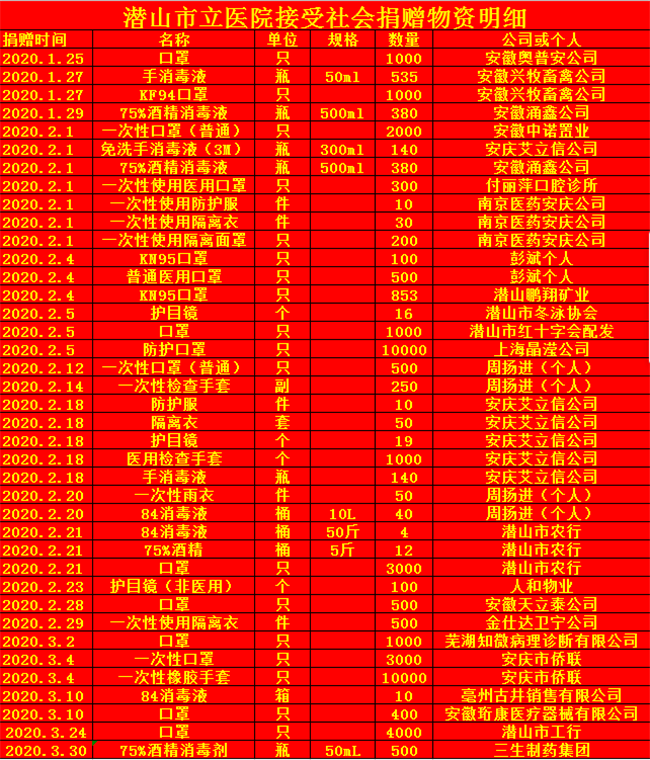自新冠肺炎疫情發(fā)生以來(lái),我院作為潛山市新冠肺炎救治定點(diǎn)醫(yī)院,全院上下堅(jiān)守使命,積極應(yīng)對(duì)疫情。在抗擊疫情的關(guān)鍵時(shí)期,我院陸續(xù)收到了來(lái)自眾多企業(yè)以及社會(huì)各界的愛(ài)心捐贈(zèng),現(xiàn)將捐贈(zèng)物資及捐款明細(xì)進(jìn)行如下公示,統(tǒng)計(jì)時(shí)間截止至2020年4月20日。(疫情期間工作繁忙,如有遺漏,敬請(qǐng)諒解?。?
