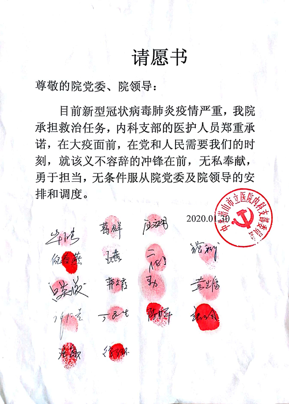 一名黨員一面旗幟,一個支部一座堡壘。面對突如其來的"新冠肺炎"疫情,潛山市立醫(yī)院內科黨支部積極踐行習近平總書記的"生命重于泰山,疫情就是命令,防控就是責任"的行動號令。支部全體黨員不忘初心、牢記使命,擔當作為、迎難而上,在支部書記華江英的帶領下,紛紛按下了紅手印,積極投身到抗擊疫情工作中。我們是白衣戰(zhàn)士,是黨的擁護者,是抗擊疫情路上的先鋒者。"若有戰(zhàn),召必至,戰(zhàn)必勝"!